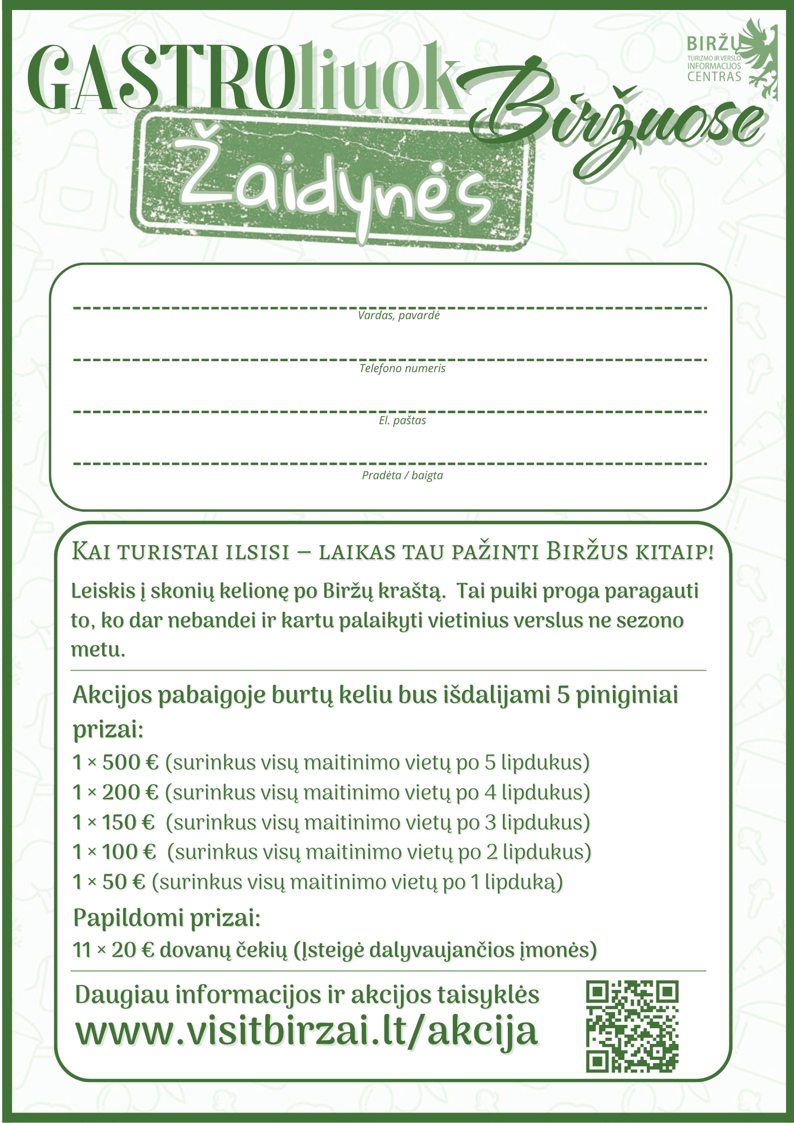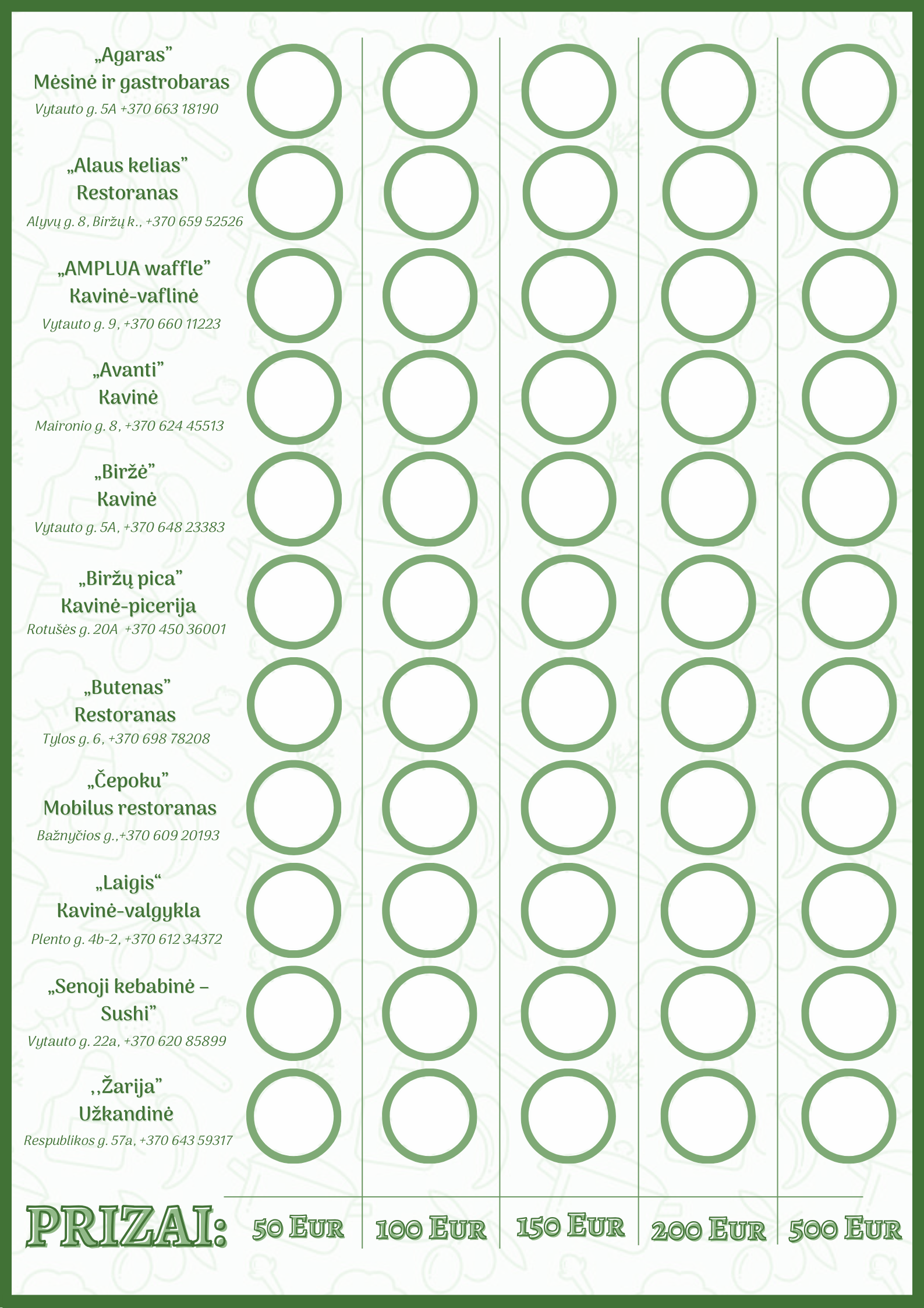1 × 50 € (surinkus visų maitinimo vietų po 1 lipduką)