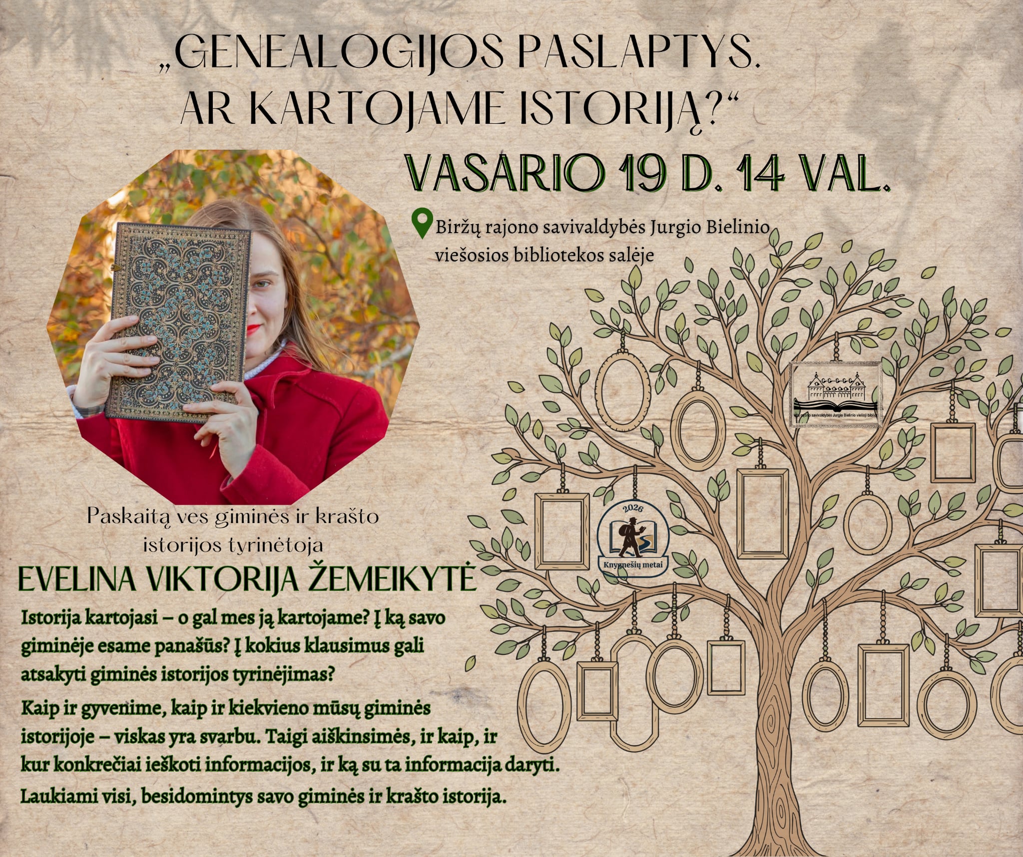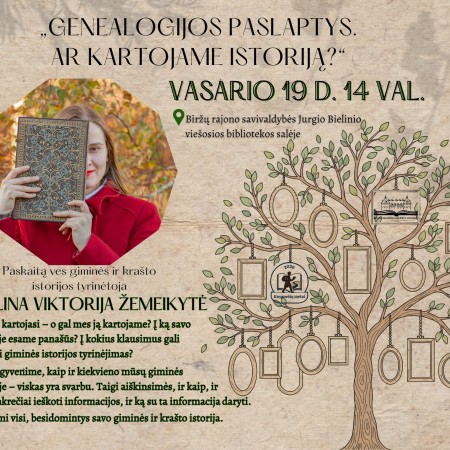 Vasario 19 d. 14 val. Biržų rajono savivaldybės Jurgio Bielinio viešojoje bibliotekoje Evelinos Viktorijos Žemeikytės paskaita „Genealogija ir šeimos istorija: kam reikalinga ir nuo ko pradėti?“ Renginys skirtas gimtosios kalbos dienai.