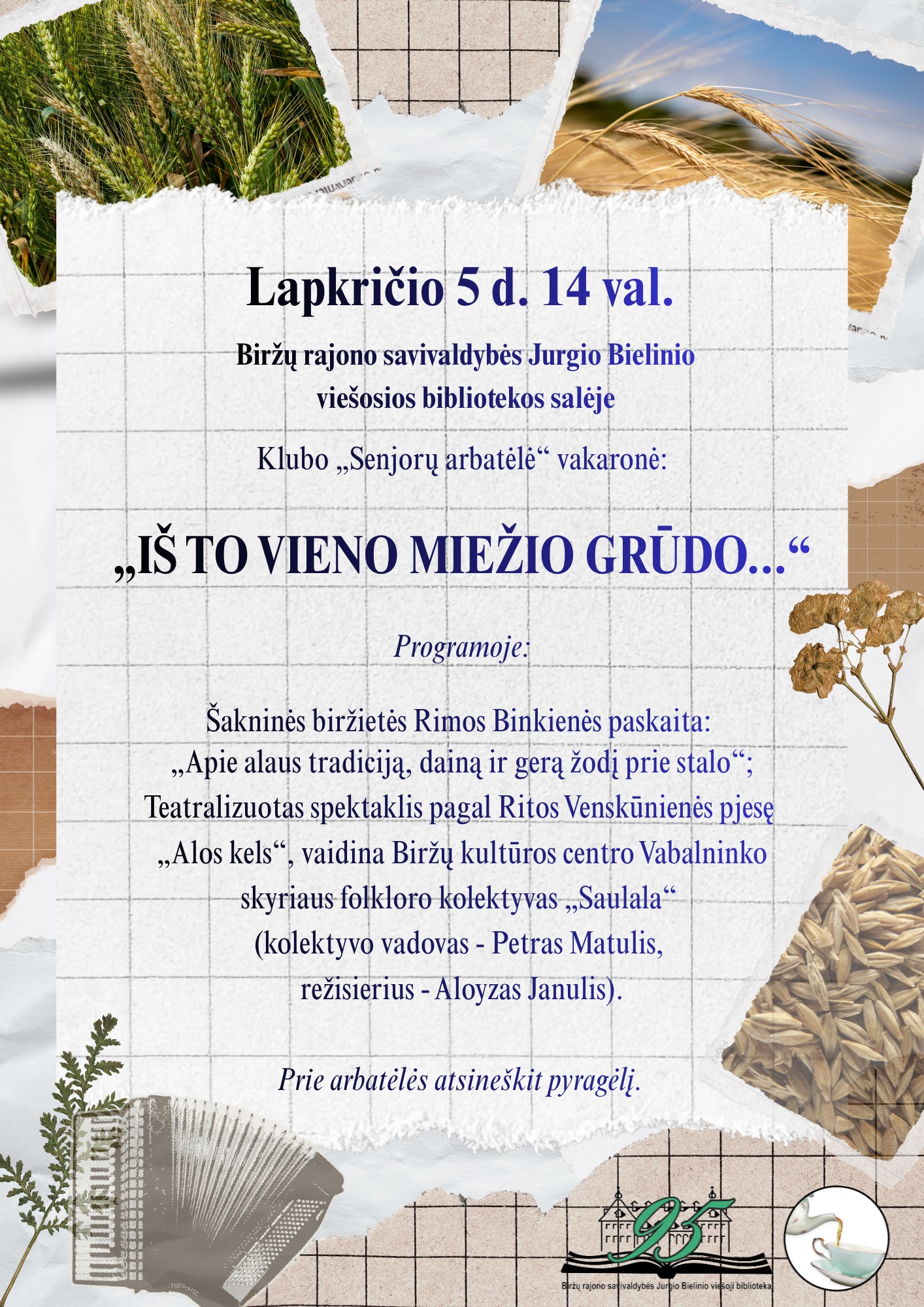 Lapkričio 5 d. 14 val. Viešosios bibliotekos salėje klubo „Senjorų arbatėlė“ popietė : „IŠ TO VIENO MIEŽIO GRŪDO...“ Programoje: Šakninės (5 kartos) biržietės Rimos Binkienės paskaita; Teatralizuotas spektaklis pagal Ritos Venskūnienės pjesę „Alos kels“, vaidina Biržų kultūros centro Vabalninko skyriaus folkloro kolektyvas „Saulala“ (kolektyvo vadovas - Petras Matulis, režisierius - Aloyzas Janulis). Prie arbatėlės – atsineškit pyragėlį.