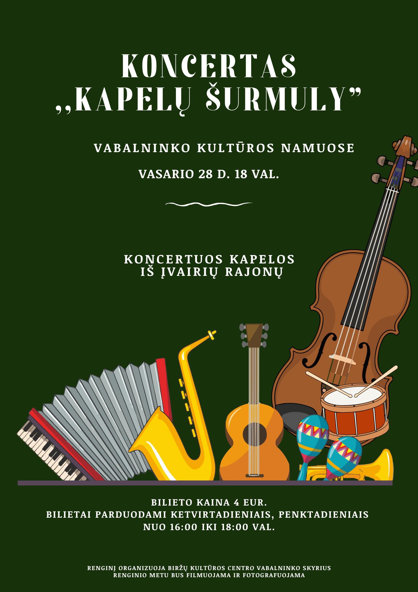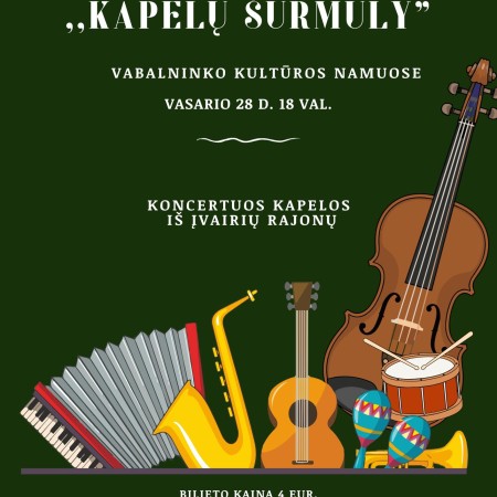 Vasario 28 d. 18 val. – Vabalninko kultūros namuose koncertas „Kapelų šurmuly“. Trukmė – 1 val. 30 min. Bilieto kaina – 4 Eur.