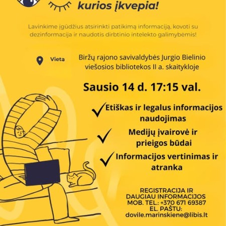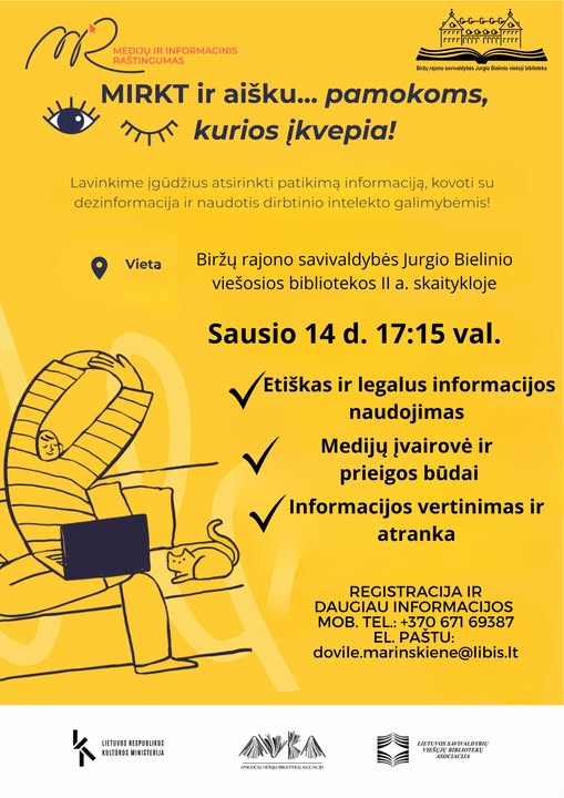 Sausio 14 d. 17:15 val. Viešojoje bibliotekoje II a. skaitykloje MIRKT (Medijų ir informacinis raštingumas) mokymai „Informacijos paieška ir vertinimas“. Daugiau informacijos el. paštu: dovile.marinskiene@libis.lt, tel. +370 671 69387