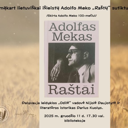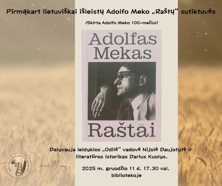 Prieš šv. Kalėdas - Adolfo Meko knygos pristatymas jo gimtuosiuose Biržuose. Labai kviečiame ir dar labiau laukiame pokalbyje apie Adolfą Meką, jo asmenybę ir jo kūrybą.