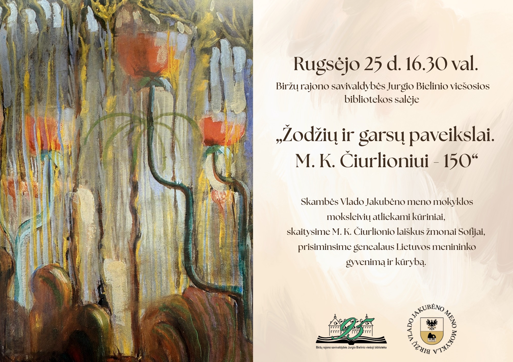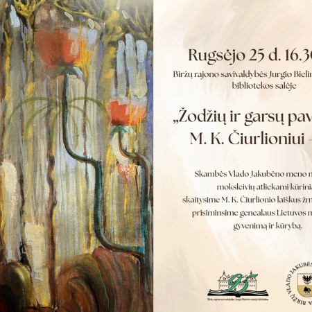 Rugsėjo 25 d. 16.30 val. Viešosios bibliotekos salėje „Žodžių ir garsų paveikslai. M. K. Čiurlioniui – 150“. Renginyje girdėsite Biržų Vlado Jakubėno meno mokyklos moksleivių atliekamus kūrinius, skaitysime M. K. Čiurlionio laiškus žmonai Sofijai, prisiminsime genealaus Lietuvos menininko gyvenimą ir kūrybą